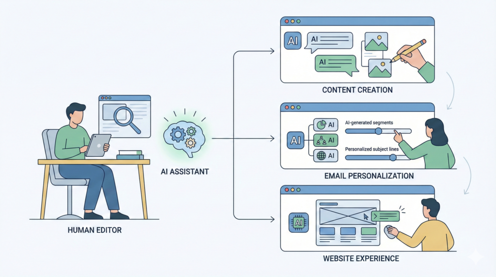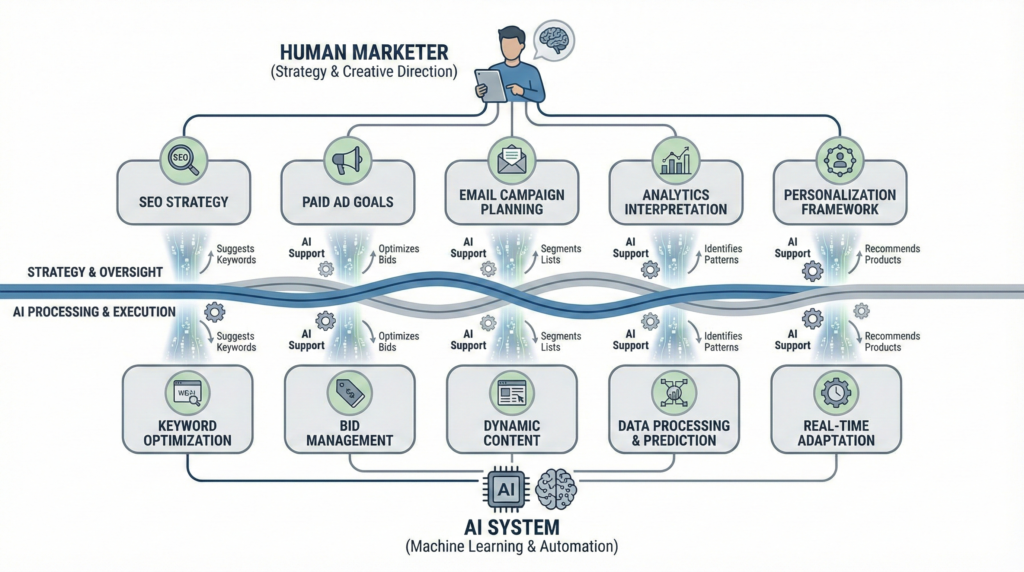 The role of ai in marketing spans three primary areas: analysis, optimization, and execution. AI acts as a decision-support layer, processing data faster and more consistently than manual methods.