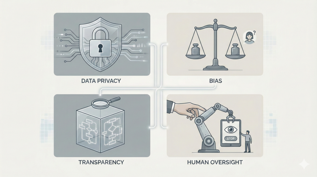 Risks include data misuse, algorithmic bias, and inaccurate outputs without proper monitoring.